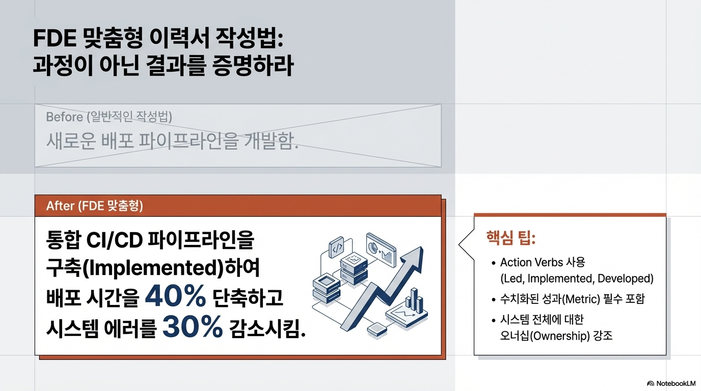 - 대신 **"통합 CI/CD 파이프라인을 구축(Implemented)하여 배포 시간을 40% 단축하고 시스템 에러를 30% 감소시킴."**과 같이 구체적으로 작성해야 합니다.