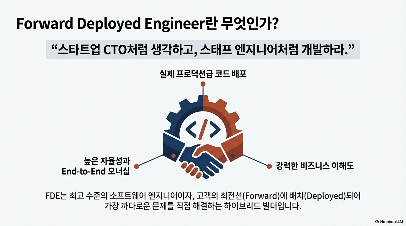 - FDE는 멈춰 있는 전문가가 아닙니다. 최전선의 고객 문제를 해결하기 위해 가장 빠르고 지속적으로 학습해야 하는 포지션입니다.