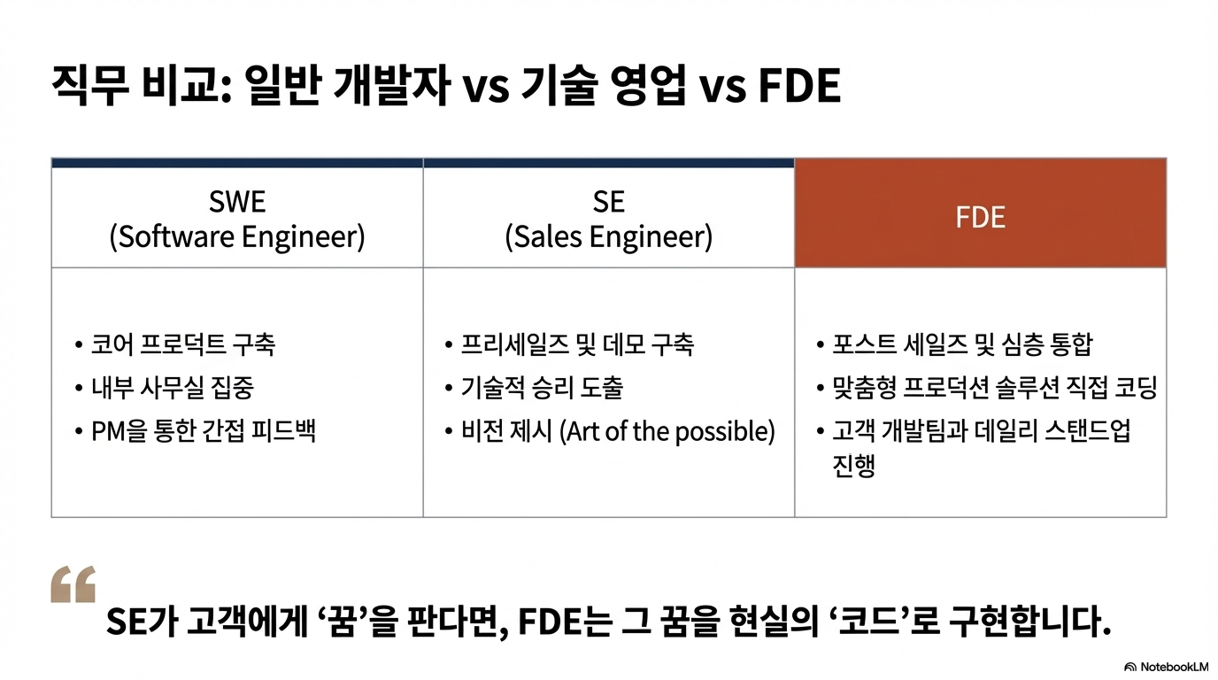 - 요약하자면, SE가 고객에게 '꿈'을 판다면, FDE는 그 꿈을 현실의 '코드'로 구현해 내는 사람입니다.