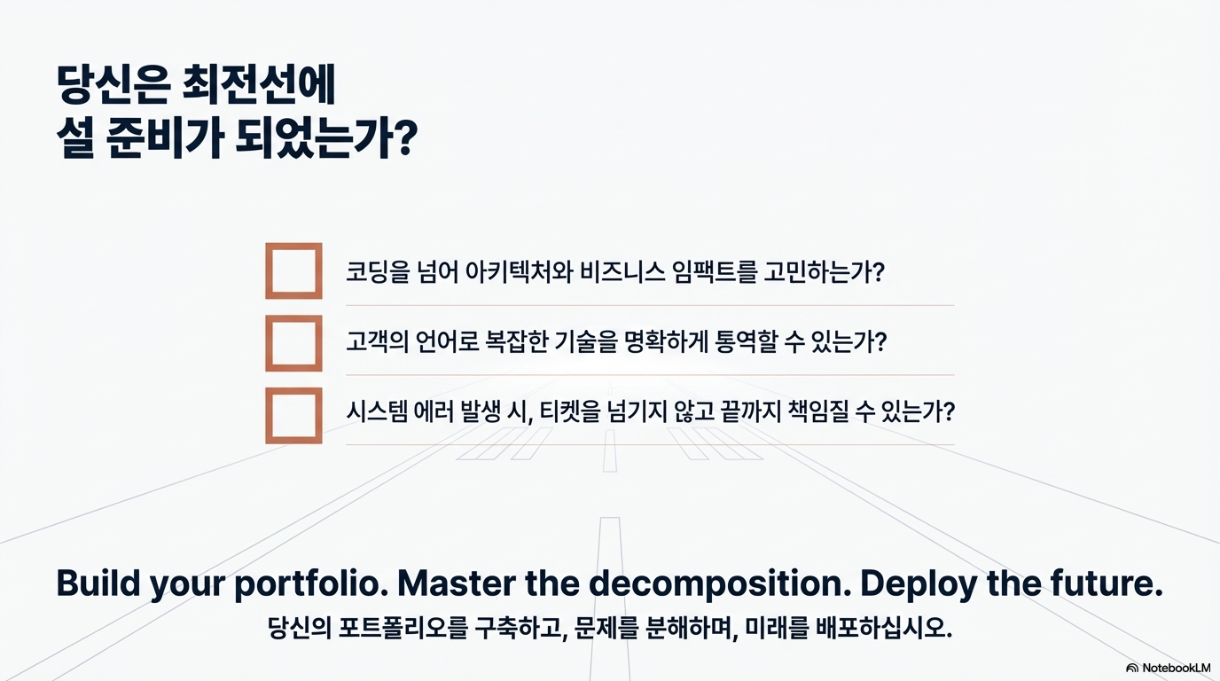 - 수평적 넓이 (Broad Execution): 에러 발생 시 끝까지 해결하는 집념과 책임감, 비즈니스 언어를 통역하는 고객 공감 능력, 모호한 문제를 쪼개는 분해(Decomposition) 능력이 필요합니다.